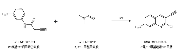 2.通过2-氰基-N-间甲苯乙酰胺和N,N-二甲基甲酰胺合成2-氯-7-甲基喹啉-3-甲腈,收率约12%;