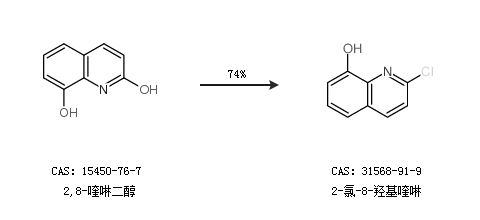 1.通过2,8-喹啉二醇合成2-氯-8-羟基喹啉,收率约74%;