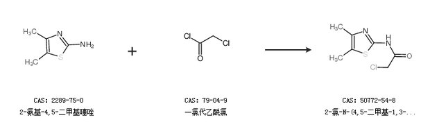 英文别名 N-(4,5-dimethyl(1,3-thiazol-2-yl))-2-chloroacetamide;2-Chloroacetylamino-4.5-dimethylthiazol;chlorodimethylthiazolylacetamide;2-Chloro-N-(4,5-dimethyl-1,3-thiazol-2-yl)acetamid;2-chloro-N-(4,5-dimethyl-thiazol-2-yl)-acetamide;