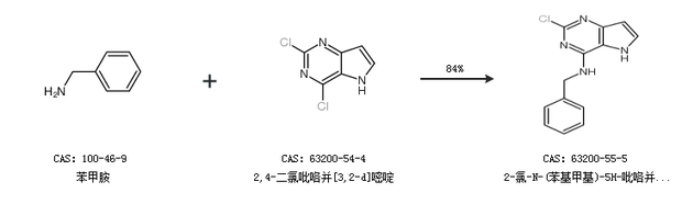 1.通过苯甲胺和2,4-二氯吡咯并[3,2-d]嘧啶合成2-氯-N-(苯基甲基)-5H-吡咯并[3,2-d]嘧啶-4-胺,收率约84%;