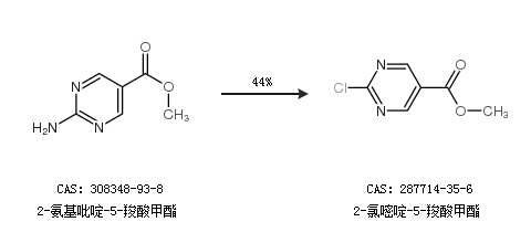 1.通过2-氨基吡啶-5-羧酸甲酯合成2-氯嘧啶-5-羧酸甲酯,收率约44%;
