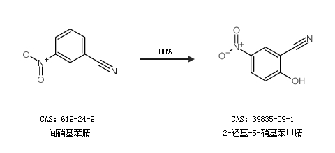 1.通过间硝基苯腈合成2-羟基-5-硝基苯甲腈,收率约88%;
