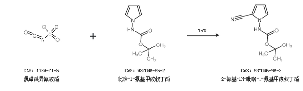 1.通过氯磺酰异氰酸酯和吡咯-1-氨基甲酸叔丁酯合成2-氰基-1H-吡咯-1-氨基甲酸叔丁酯,收率约75%;