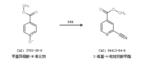 2.通过甲基异烟酸-N-氧化物合成2-氰基-4-吡啶羧酸甲酯,收率约64%;