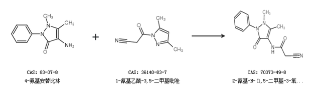 2.通过4-氨基安替比林和1-氰基乙酰-3,5-二甲基吡唑合成2-氰基-N-(1,5-二甲基-3-氧代-2-苯基-2,3-二氢-1H-吡唑-4-基)-乙酰胺