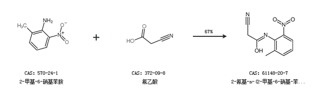 1.通过2-甲基-6-硝基苯胺和氰乙酸合成2-氰基-n-(2-甲基-6-硝基-苯基)乙酰胺,收率约67%;