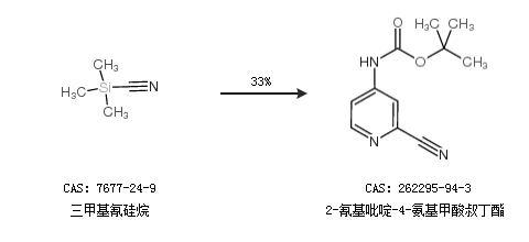 1.通过三甲基氰硅烷合成2-氰基吡啶-4-氨基甲酸叔丁酯,收率约33%;