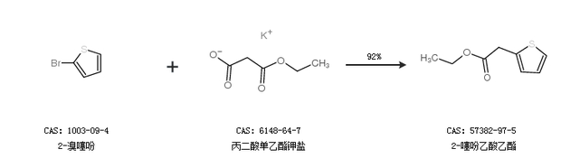 2.通过2-溴噻吩和丙二酸单乙酯钾盐合成2-噻吩乙酸乙酯,收率约92%;