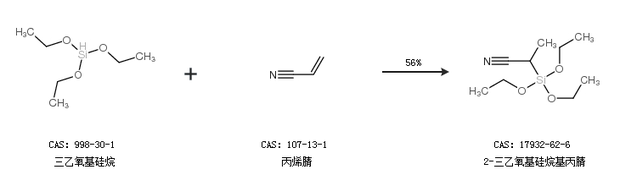 1.通过三乙氧基硅烷和丙烯腈合成2-三乙氧基硅烷基丙腈,收率约56%;
