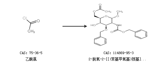 1.通过乙酰氯合成2-脱氧-2-[[(苯基甲氧基)羰基]氨基]-3-O-(苯基甲基)-alpha-D-吡喃葡萄糖苷 6-乙酸甲酯