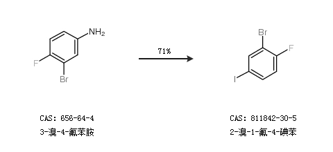 1.通过3-溴-4-氟苯胺合成2-溴-1-氟-4-碘苯,收率约71%;