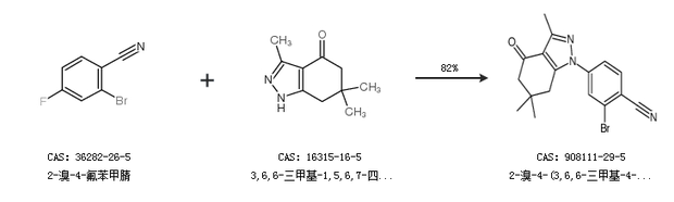 2.通过2-溴-4-氟苯甲腈和3,6,6-三甲基-1,5,6,7-四氢-4H-吲唑-4-酮合成2-溴-4-(3,6,6-三甲基-4-氧代-4,5,6,7-四氢-1H-吲唑-1-基)苯甲腈,收率约82%;