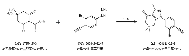 1.通过2-乙酰基-5,5-二甲基-1,3-环己二酮和2-溴-4-肼基苯甲腈合成2-溴-4-(3,6,6-三甲基-4-氧代-4,5,6,7-四氢-1H-吲唑-1-基)苯甲腈,收率约91%;