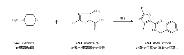 2.通过N-甲基吗啡啉和2-溴-4-甲基噻唑-5-羧酸合成2-溴-4-甲基-N-(吡啶-3-甲基)噻唑-5-羧酰胺,收率约57%;
