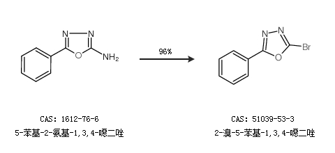 1.通过5-苯基-2-氨基-1,3,4-噁二唑合成2-溴-5-苯基-1,3,4-噁二唑,收率约96%;