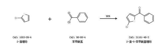 1.通过2-溴噻吩和苯甲酰氯合成2-溴-5-苯甲酰基噻吩,收率约98%;