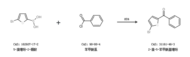 2.通过5-溴噻吩-2-硼酸和苯甲酰氯合成2-溴-5-苯甲酰基噻吩,收率约85%;