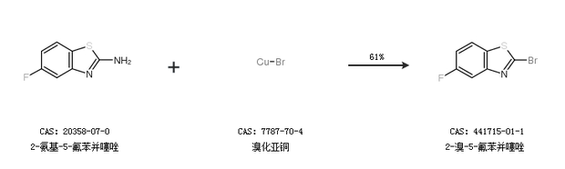 2.通过2-氨基-5-氟苯并噻唑和溴化亚铜合成2-溴-5-氟苯并噻唑,收率约61%;