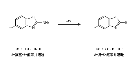 1.通过2-氨基-5-氟苯并噻唑合成2-溴-5-氟苯并噻唑,收率约64%;