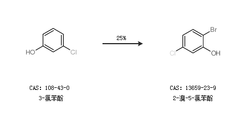 2.通过3-氯苯酚合成2-溴-5-氯苯酚,收率约25%;