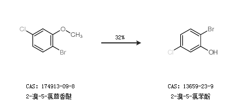 1.通过2-溴-5-氯茴香醚合成2-溴-5-氯苯酚,收率约32%;