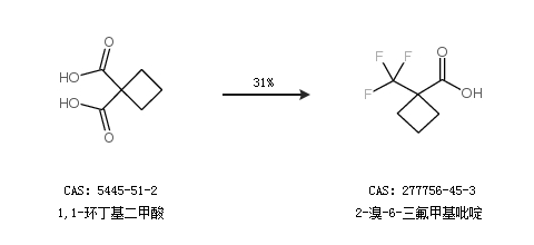 1.通过1,1-环丁基二甲酸合成2-溴-6-三氟甲基吡啶,收率约31%;