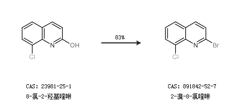 1.通过8-氯-2-羟基喹啉合成2-溴-8-氯喹啉,收率约83%;