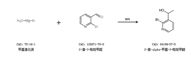2.通过甲基溴化镁和2-溴-3-吡啶甲醛合成2-溴-alpha-甲基-3-吡啶甲醇,收率约96%;