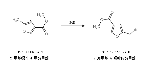 2.通过2-甲基噁唑-4-甲酸甲酯合成2-溴甲基-4-噁唑羧酸甲酯,收率约34%;