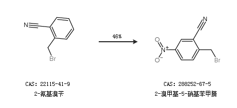 2.通过2-氰基溴苄合成2-溴甲基-5-硝基苯甲腈,收率约46%;