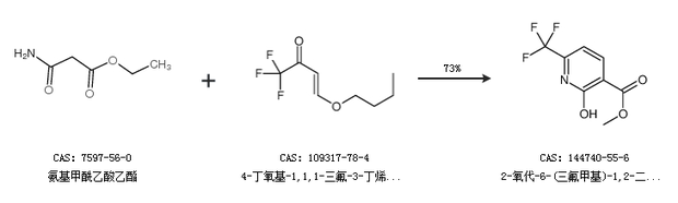 2.通过氨基甲酰乙酸乙酯和4-丁氧基-1,1,1-三氟-3-丁烯-2-酮合成2-氧代-6-(三氟甲基)-1,2-二氢吡啶-3-羧酸甲酯,收率约73%;