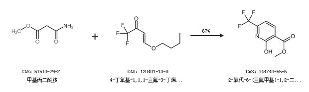1.通过甲基丙二酰胺和4-丁氧基-1,1,1-三氟-3-丁烯-2-酮合成2-氧代-6-(三氟甲基)-1,2-二氢吡啶-3-羧酸甲酯,收率约67%;