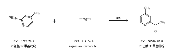1.通过2-氰基-4-甲基吡啶和magnesium,carbanide,iodide合成2-乙酰-4-甲基吡啶,收率约52%;