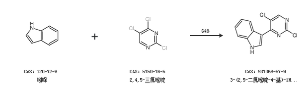 1.通过吲哚和2,4,5-三氯嘧啶合成3-(2,5-二氯嘧啶-4-基)-1H-吲哚,收率约64%;