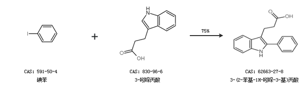 1.通过碘苯和3-吲哚丙酸合成3-(2-苯基-1H-吲哚-3-基)丙酸,收率约75%;
