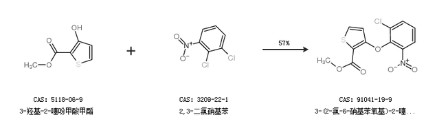 1.通过3-羟基-2-噻吩甲酸甲酯和2,3-二氯硝基苯合成3-(2-氯-6-硝基苯氧基)-2-噻吩羧酸甲酯,收率约57%;