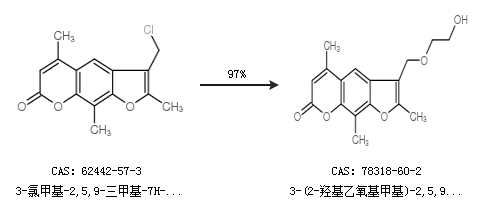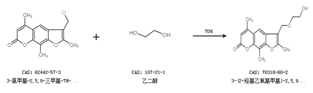 2.通过3-氯甲基-2,5,9-三甲基-7H-呋喃并[3,2-g][1]苯并吡喃-7-酮和乙二醇合成3-(2-羟基乙氧基甲基)-2,5,9-三甲基呋喃并[3,2-g]色烯-7-酮,收率约70%;