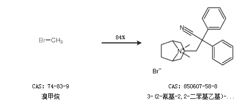 1.通过溴甲烷合成3-(2-氰基-2,2-二苯基乙基)-8,8-二甲基-8-氮杂二环[3.2.1]辛烷溴化物,收率约84%;