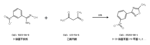 2.通过3-硝基苄胺肟和乙酰丙酮合成3-(3-硝基苯基)-5-甲基-1,2,4-恶二唑,收率约18%;