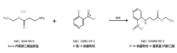 1.通过beta-丙氨酸乙酯盐酸盐和4-氯-3-硝基吡啶合成3-(3-硝基吡啶-4-基氨基)丙酸乙酯,收率约60%;