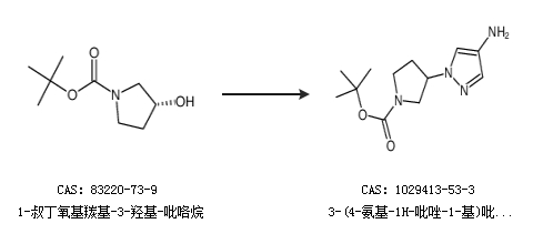 1.通过1-叔丁氧基羰基-3-羟基-吡咯烷合成3-(4-氨基-1H-吡唑-1-基)吡咯烷-1-羧酸叔丁酯