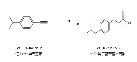 1.通过1-乙炔-4-异丙基苯合成3-(4-异丁基苯基)-丙酸,收率约4%;