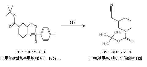 1.通过3-(甲苯磺酰氧基甲基)哌啶-1-羧酸叔丁酯合成3-(氰基甲基)哌啶-1-羧酸叔丁酯,收率约91%;