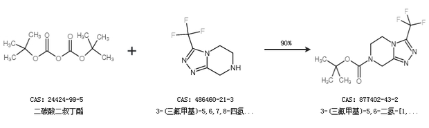 1.通过二碳酸二叔丁酯和3-(三氟甲基)-5,6,7,8-四氢-[1,2,4]三唑并[4,3-a]吡嗪合成3-(三氟甲基)-5,6-二氢-[1,2,4]噻唑[4,3-A]吡嗪-7(8H)-羧酸叔丁酯,收率约90%;