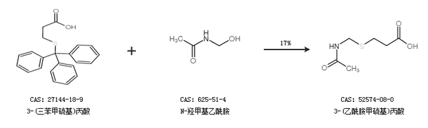 2.通过3-(三苯甲硫基)丙酸和N-羟甲基乙酰胺合成3-(乙酰胺甲硫基)丙酸,收率约17%;