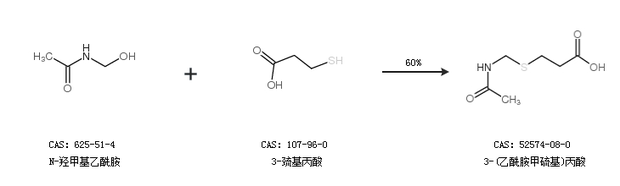 1.通过N-羟甲基乙酰胺和3-巯基丙酸合成3-(乙酰胺甲硫基)丙酸,收率约60%;