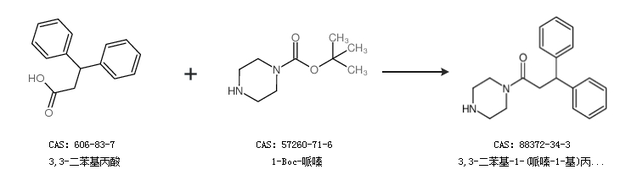 1.通过3,3-二苯基丙酸和1-Boc-哌嗪合成3,3-二苯基-1-(哌嗪-1-基)丙烷-1-酮