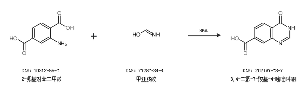 1.通过2-氨基对苯二甲酸和甲亚胺酸合成3,4-二氢-7-羧基-4-喹唑啉酮,收率约86%;