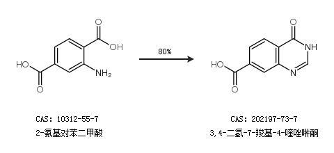 2.通过2-氨基对苯二甲酸合成3,4-二氢-7-羧基-4-喹唑啉酮,收率约80%;