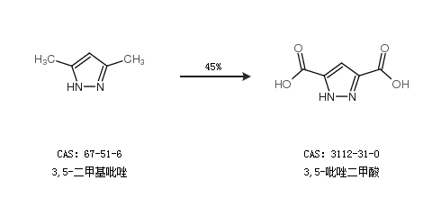 1.通过3,5-二甲基吡唑合成3,5-吡唑二甲酸,收率约45%;